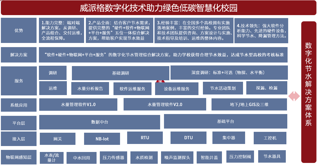 威派格積極響應(yīng)國家政策,為加快國家節(jié)水行動政策的快速落地建言獻策。針對高校用水現(xiàn)狀,依據(jù)節(jié)水型高校建設(shè)標準,我們結(jié)合多年的水務(wù)運行管理經(jīng)驗與高校應(yīng)用場景打造數(shù)字化節(jié)水解決方案,主要通過以下幾個方面的建設(shè)來實現(xiàn)校園的節(jié)水目標: