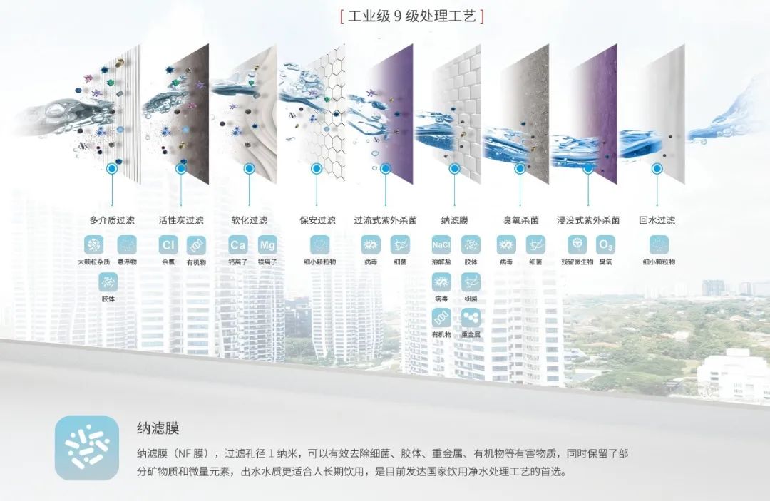 納濾是整個(gè)處理過程的核心工藝,其特點(diǎn)是不僅可以去除水中殘留的微量化學(xué)物質(zhì)(如農(nóng)藥、殺蟲劑等)以及消毒副產(chǎn)物,并能夠保留水中對人體有益的微量元素和礦物質(zhì),使飲用水更健康。