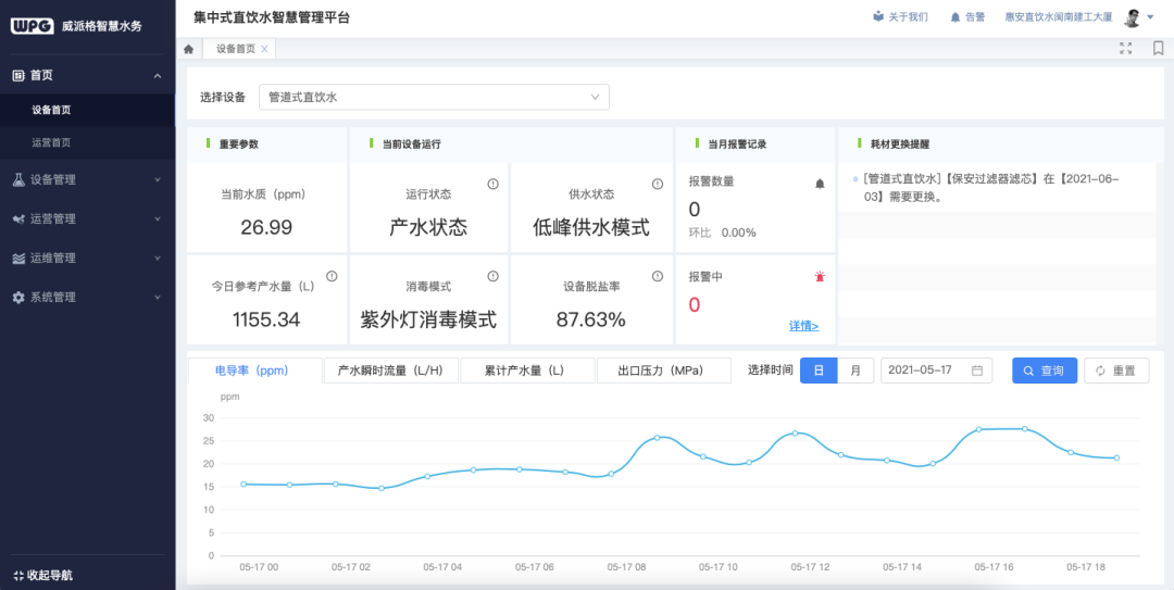不同于常見的單一設(shè)備,威派格直飲水設(shè)備集水質(zhì)監(jiān)測、運(yùn)維管理、遠(yuǎn)程監(jiān)控及各部件、耗材的全生命周期管理為一體。威派格提供完善的售后服務(wù)運(yùn)維體系,針對設(shè)備原理、操作安全以及日常維護(hù),提供專業(yè)的技術(shù)人員進(jìn)行培訓(xùn),確保出水水質(zhì)長期穩(wěn)定,保證入口的每一滴水都合格健康,同時(shí)讓物業(yè)人員運(yùn)維管理更加高效便捷。
